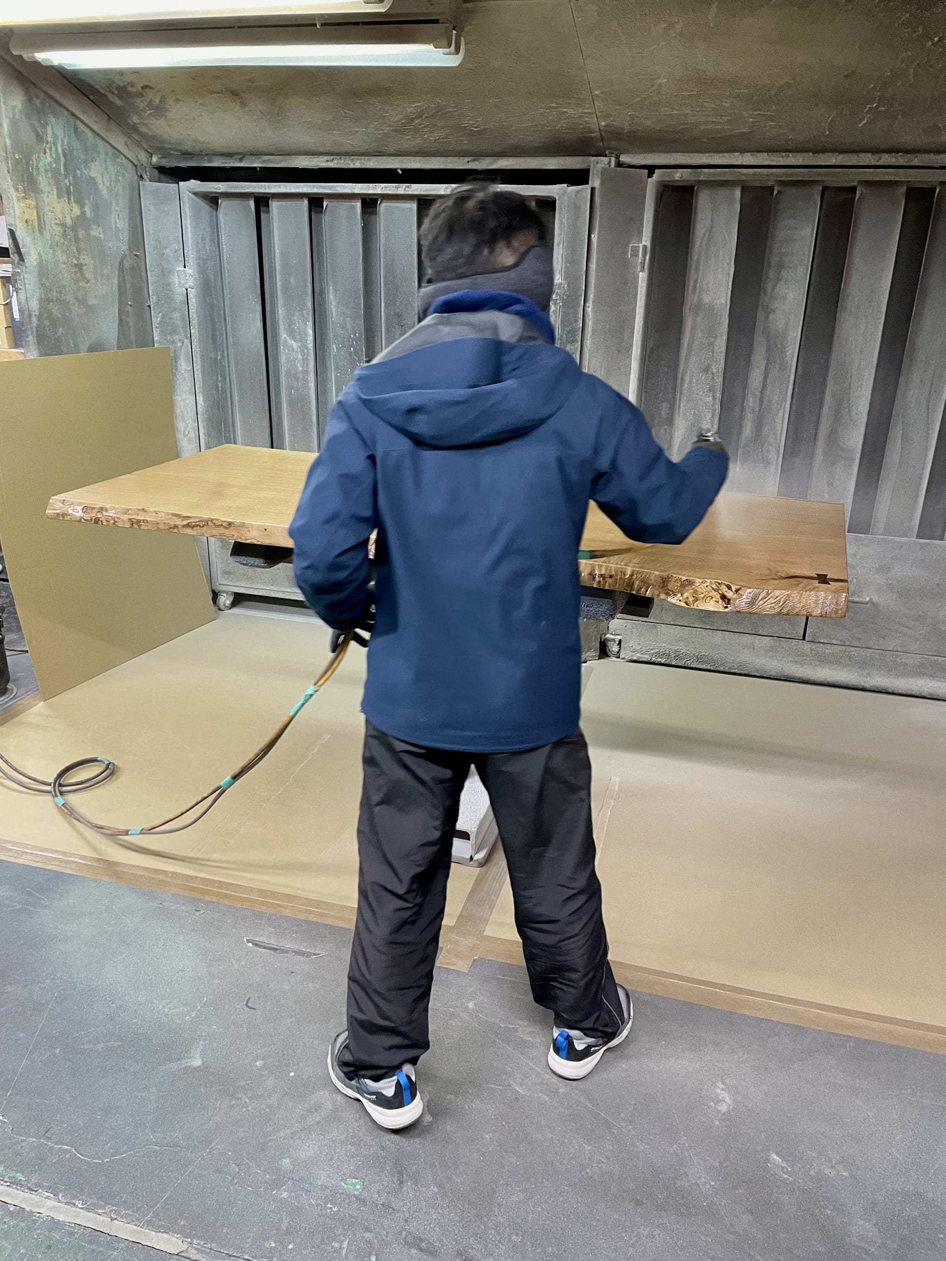 最後の工程となる「塗装」では、丁寧に磨き上げた後に、ベテランの職人が専用のブースで均等に塗装を施すことで、思わず撫でてみたくなるような心地良いテーブルへと仕立てていきます。