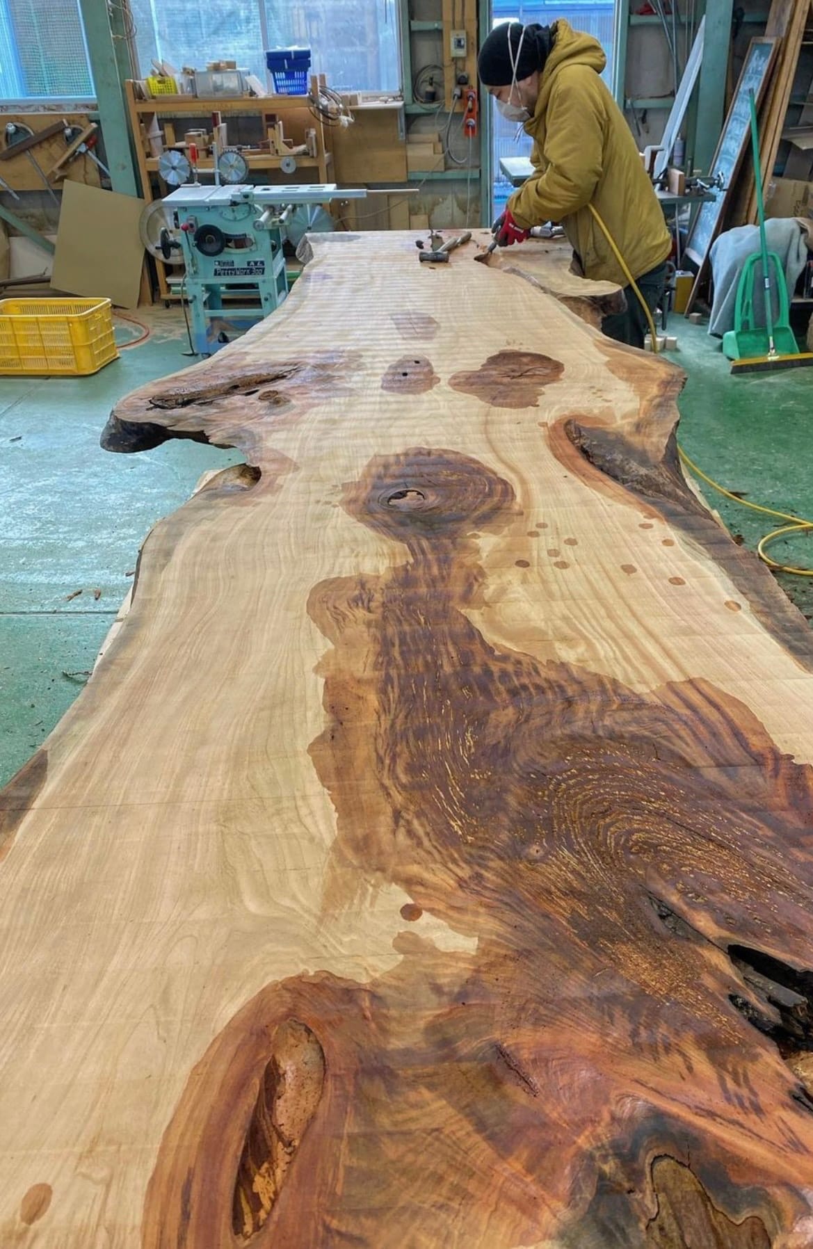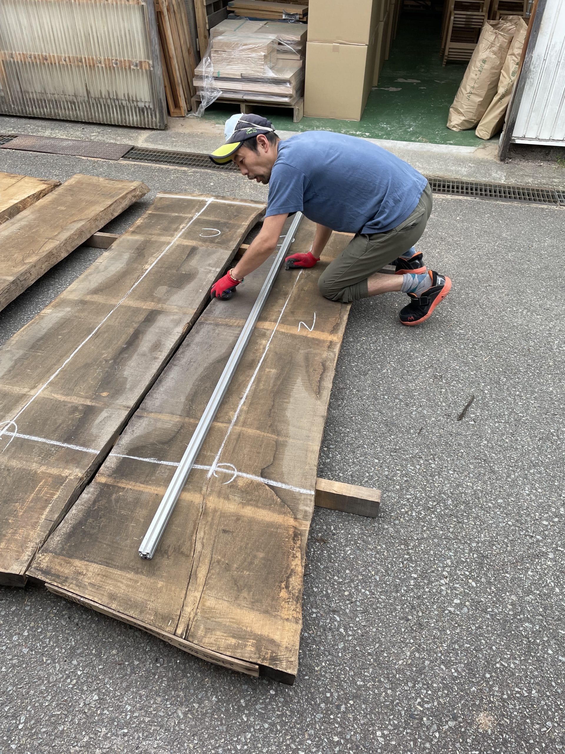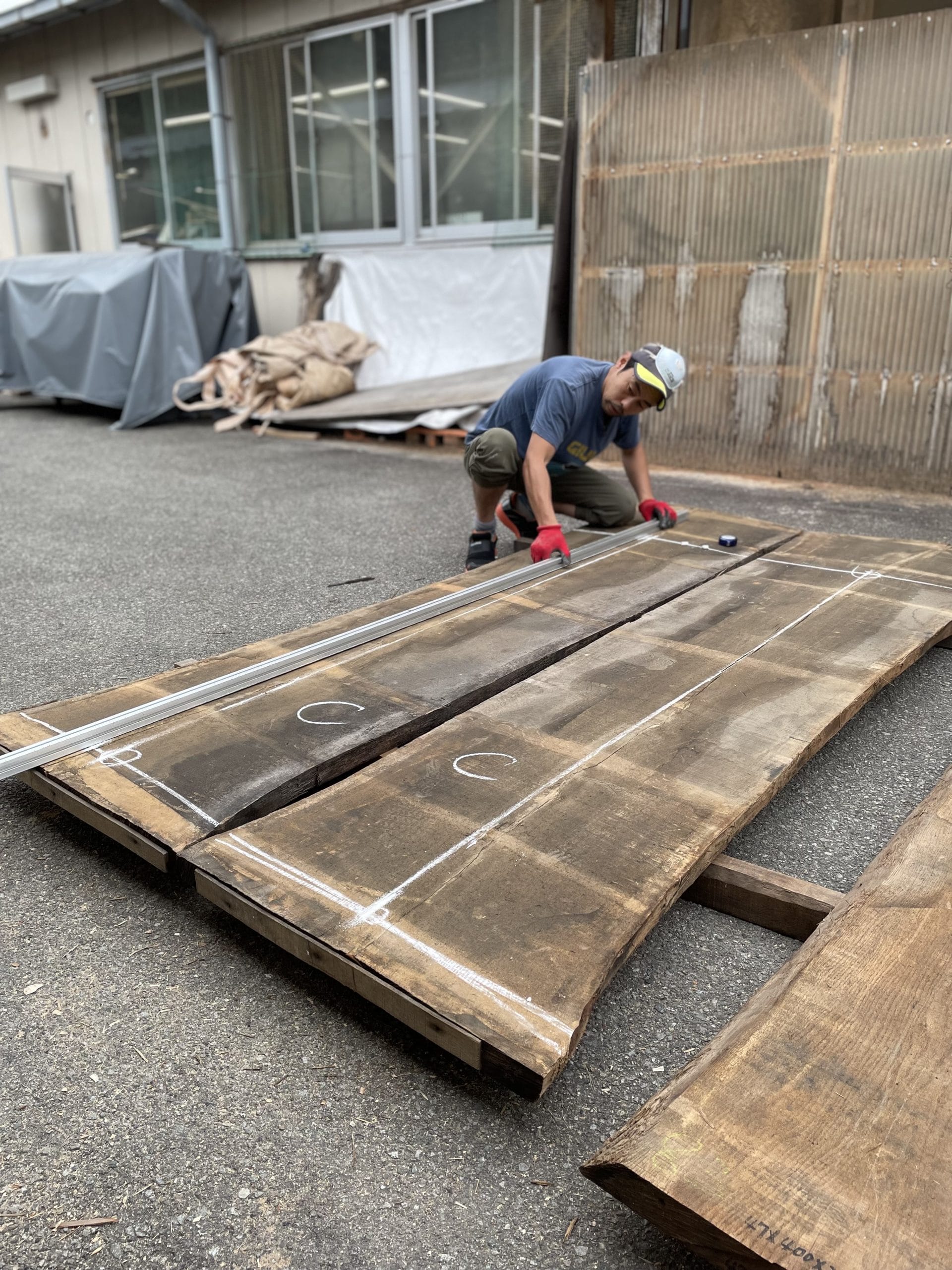 これは、仕上がりをイメージしながら、どの部分をどのようにカットすれば無駄なく美しいテーブルや小物に仕立てられるかを決める作業です。