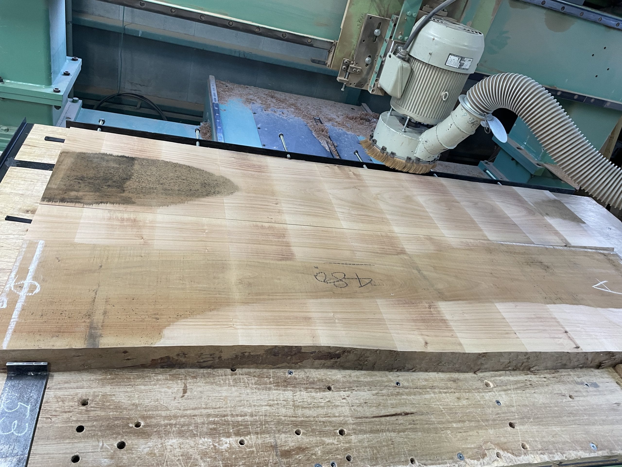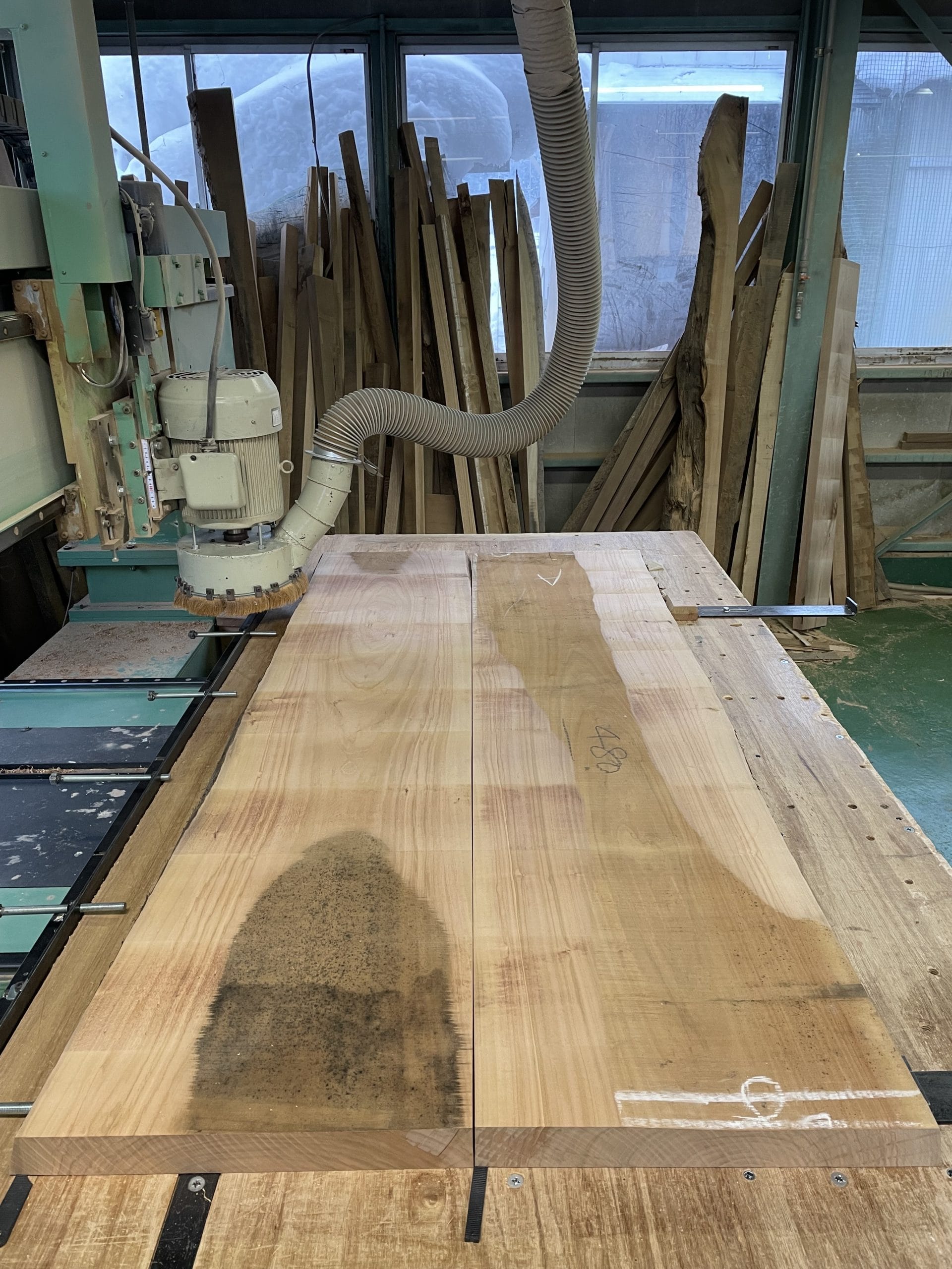 接着を終えた板は、自然の美しさを最大限に活かすために「加工」へと進みます。