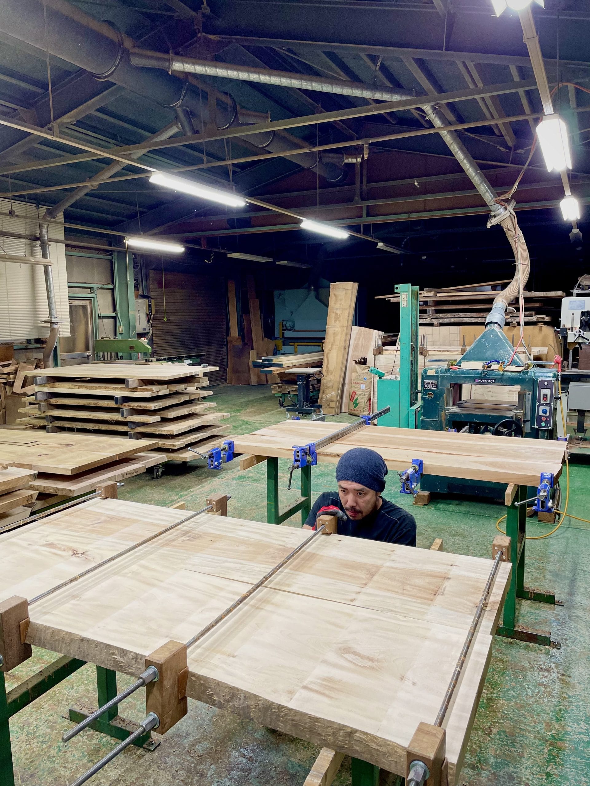 木材は温度や湿度に敏感で、季節や気候によって膨張・収縮が異なるため、接着工程でのコンディション管理はとても重要です。